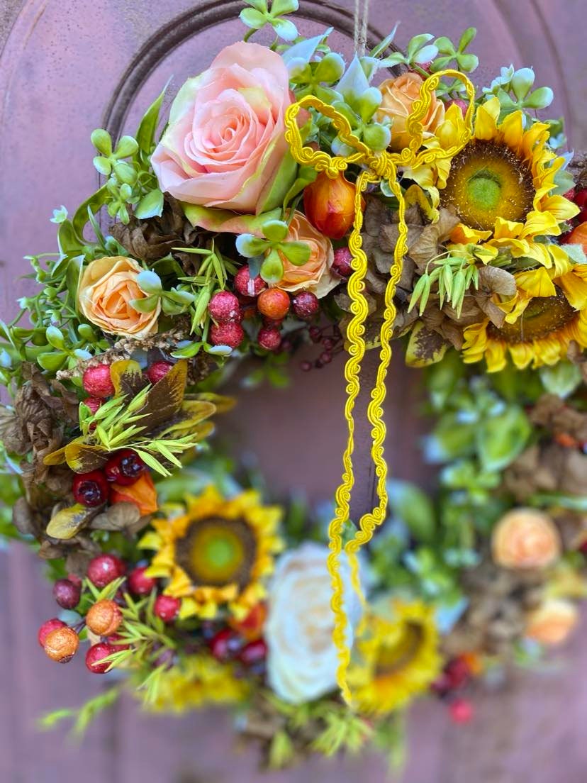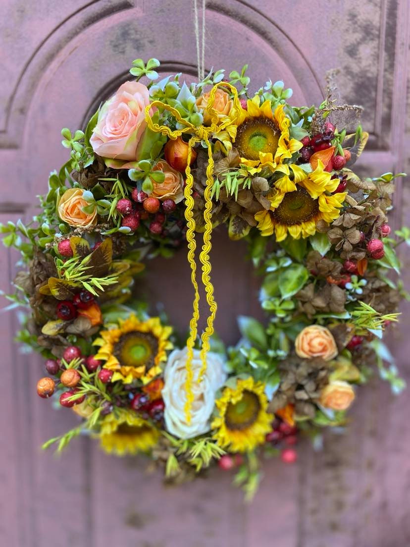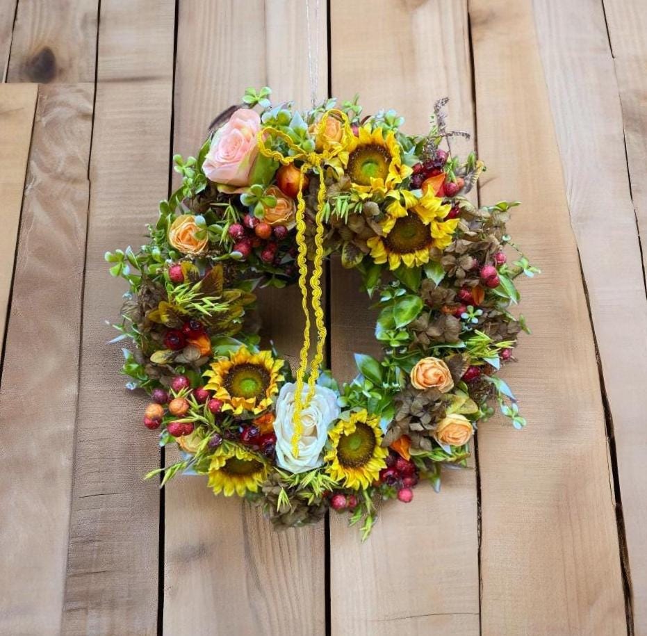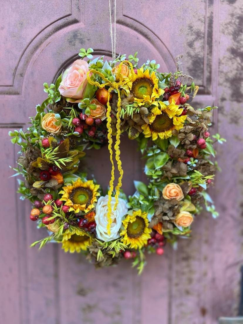 We use high-quality silk to create realistic yellow sunflower wreaths. Naturally fresh, non-toxic and harmless, vibrant colors, so beautiful and charming. The wreath features a simple, elegant, and comfortable color, with a vibrant natural shape. The floral wreath accented with green leaves creates a romantic look, adding vitality to your indoors and outdoors.