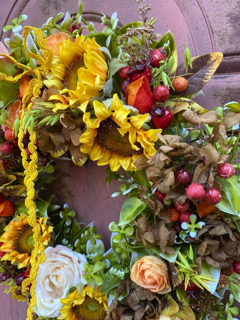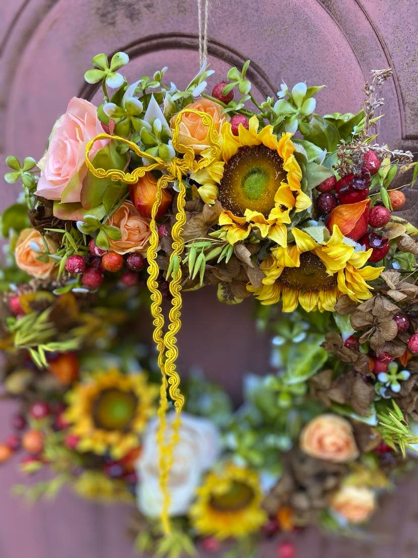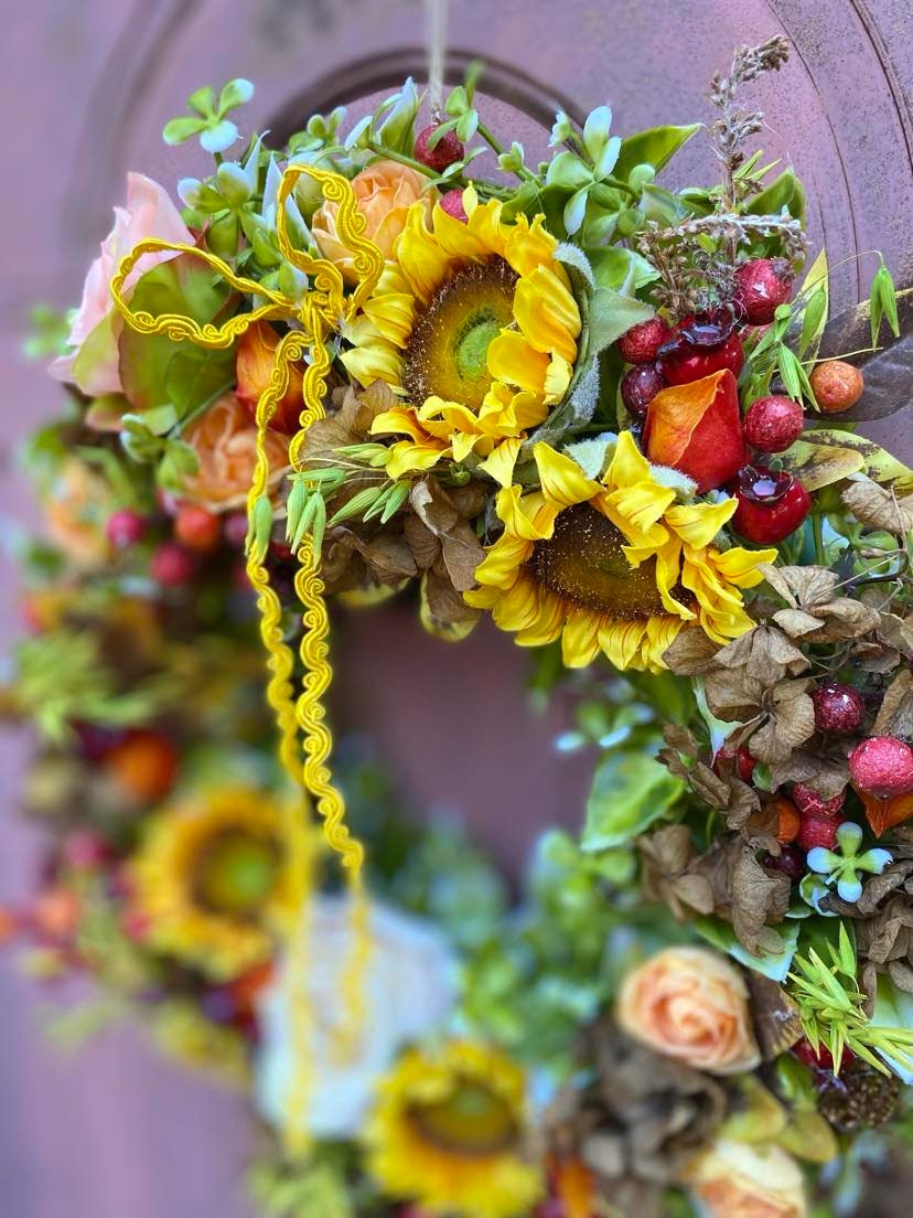 We use high-quality silk to create realistic yellow sunflower wreaths. Naturally fresh, non-toxic and harmless, vibrant colors, so beautiful and charming. The wreath features a simple, elegant, and comfortable color, with a vibrant natural shape. The floral wreath accented with green leaves creates a romantic look, adding vitality to your indoors and outdoors.