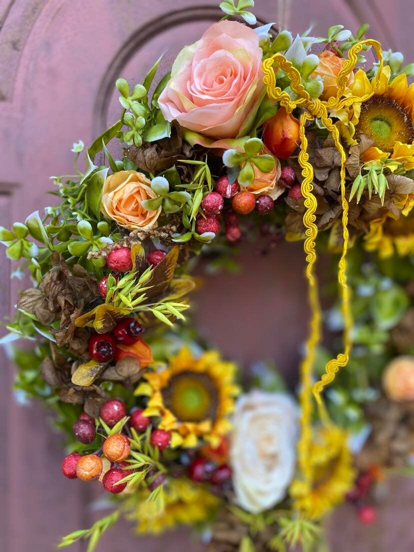 The flowers are made of silk fabric and plastic, the wreath ring is made of natural rattan ring, which is lightweight and not easy to fade, with a realistic texture and durable.