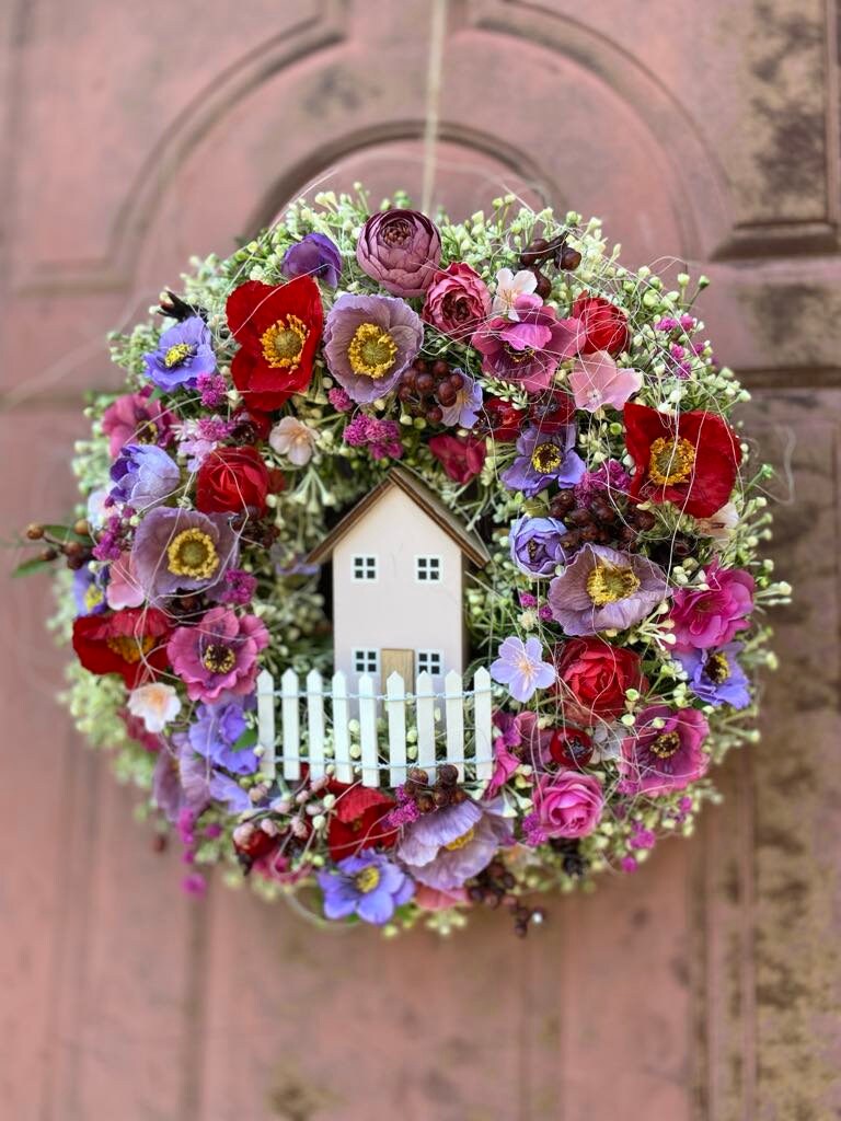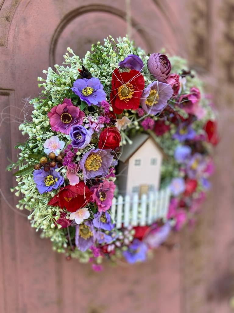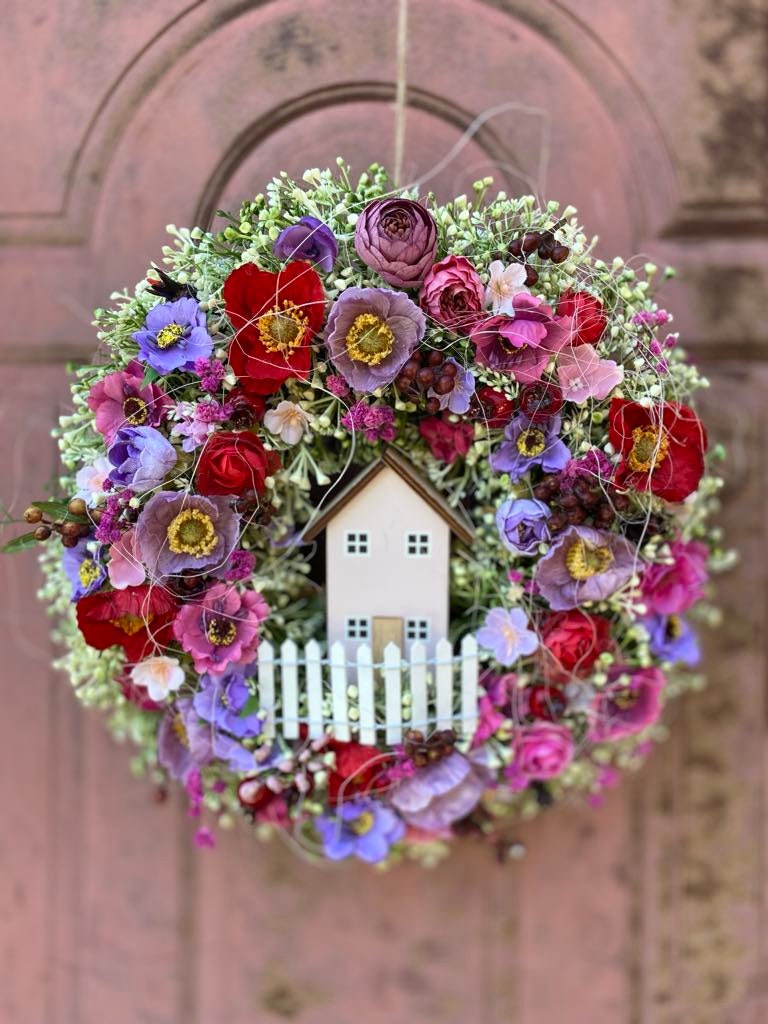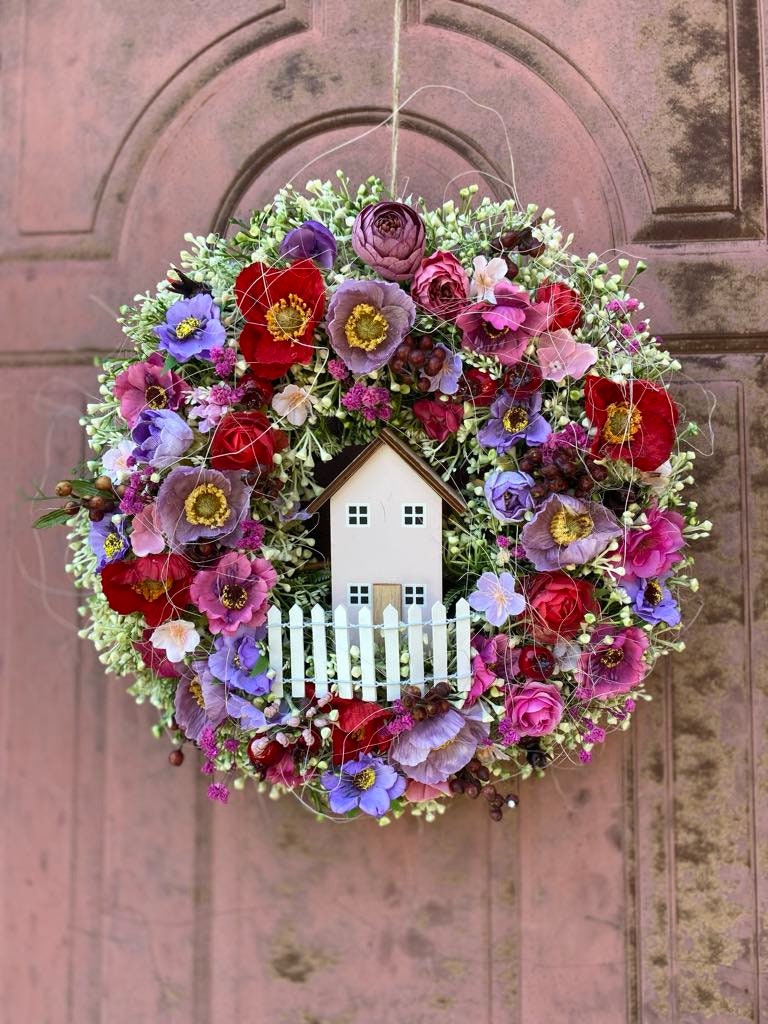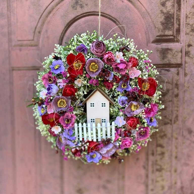 The flowers are made of silk fabric and plastic, the wreath ring is made of natural rattan ring, which is lightweight and not easy to fade, with a realistic texture and durable.