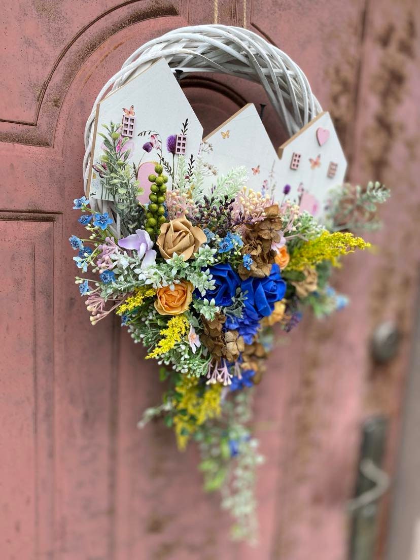 The wreath's green leaves blend harmoniously into any setting, creating a warm and inviting atmosphere. This spring wreath is perfect for front doors, walls, windows, fireplaces, porches, entryways, etc.