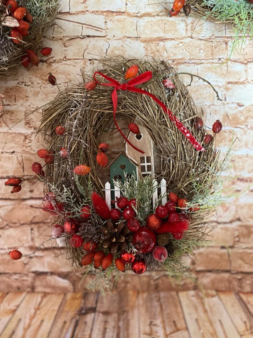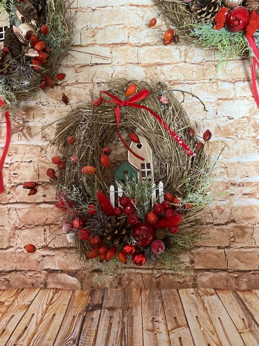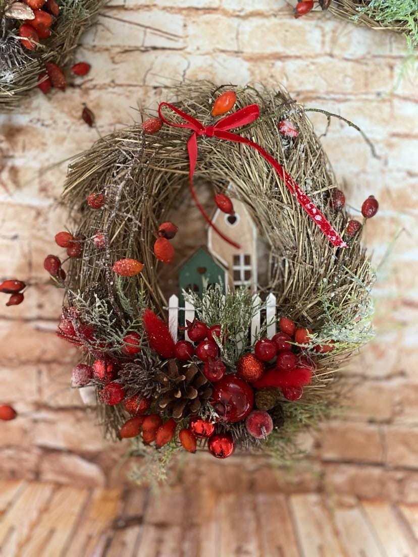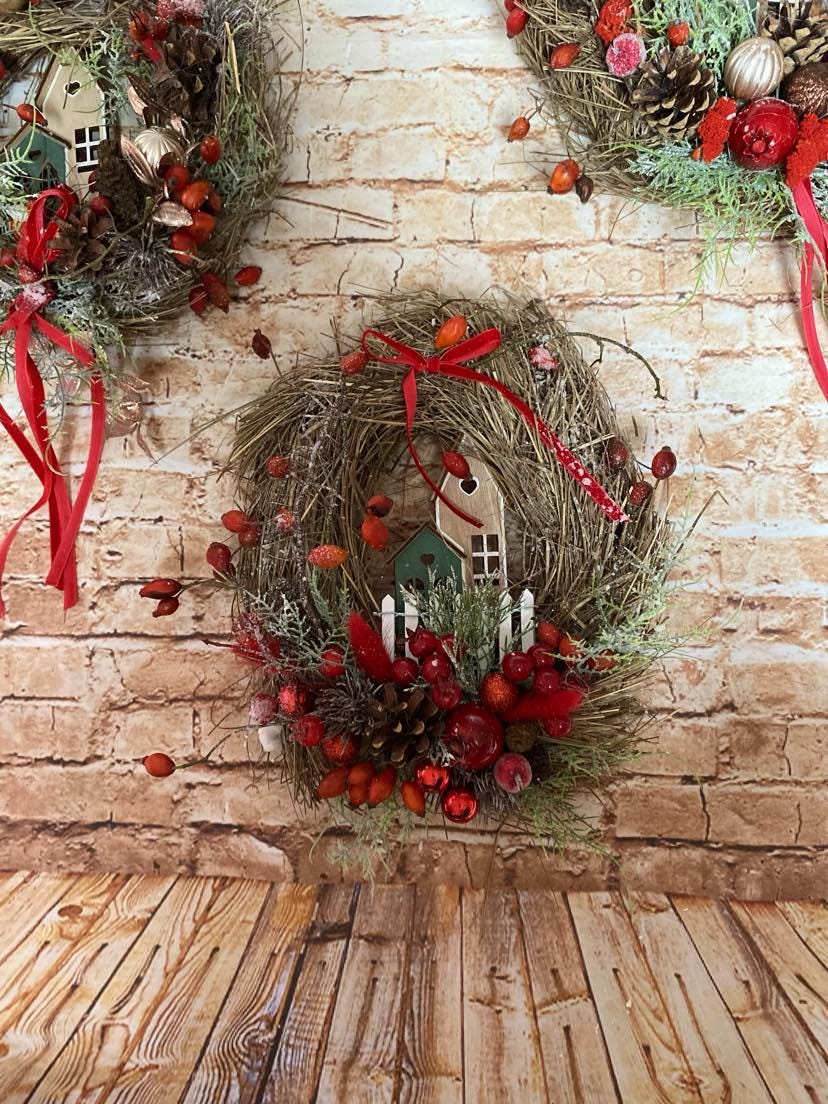 Christmas wreath is decorated with a house.The wreath is very suitable for Christmas decoration, looks beautiful on the covered porch indoors or outdoors.