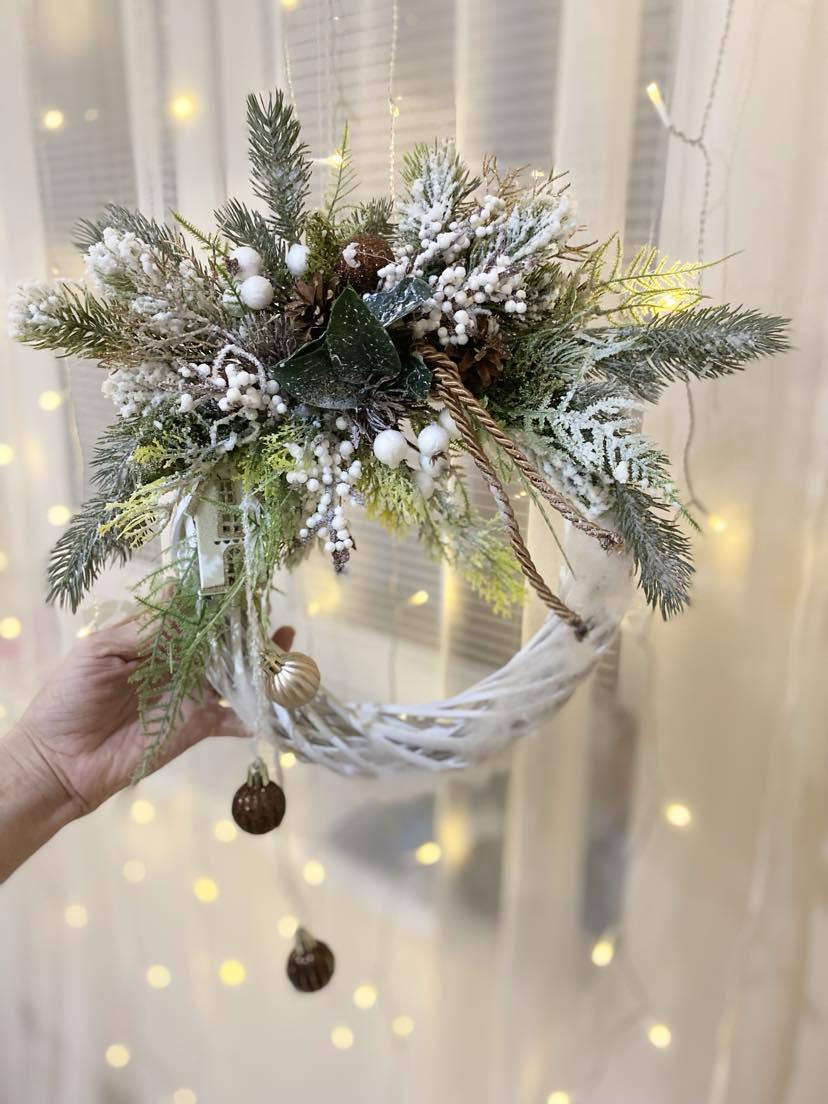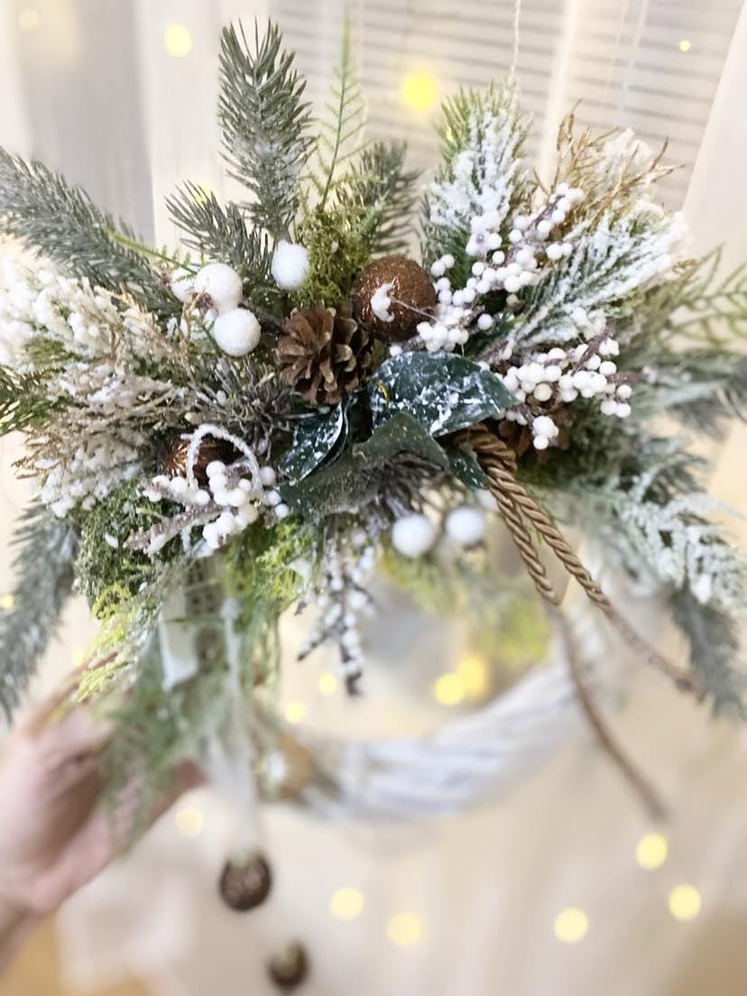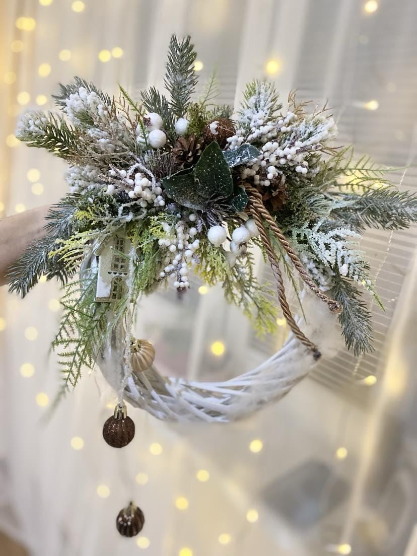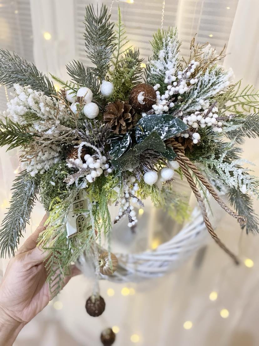 Delight your home with Christmas spirit with this beautiful Christmas wreath on a white rattan base. This wreath is not only suitable for hanging on the door, but also fits perfectly into your interior. The white rattan base is decorated with high quality faux chenille, white berries, pinecones and Christmas balls in brown, giving it an elegant and sophisticated look. Create a cozy Christmas atmosphere with this beautiful product that is sure to attract stars and add charm to your home.