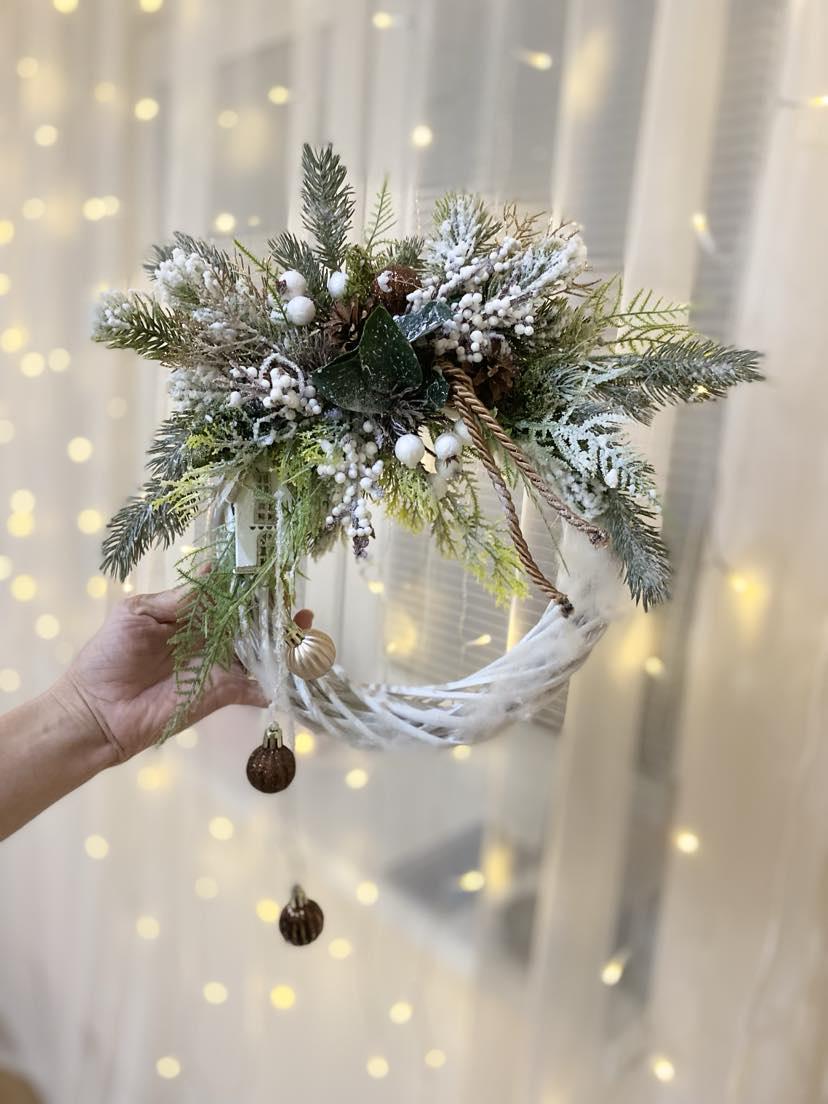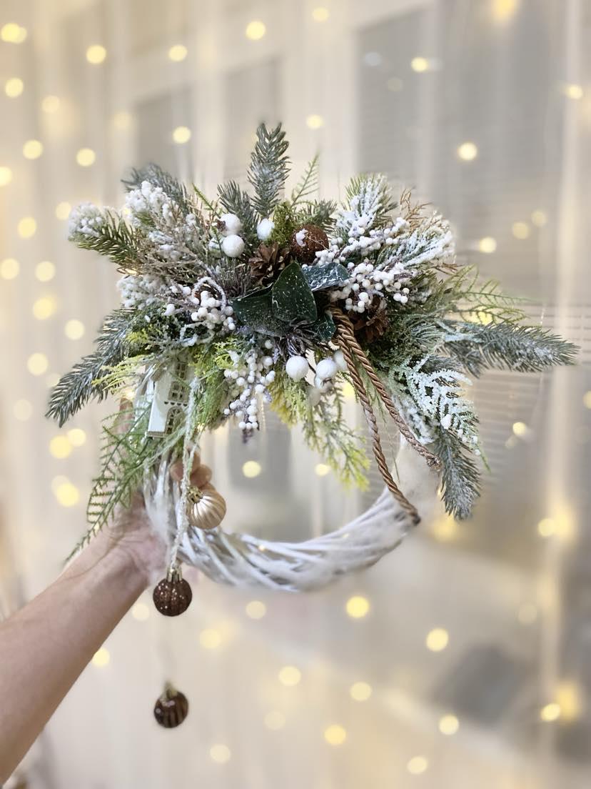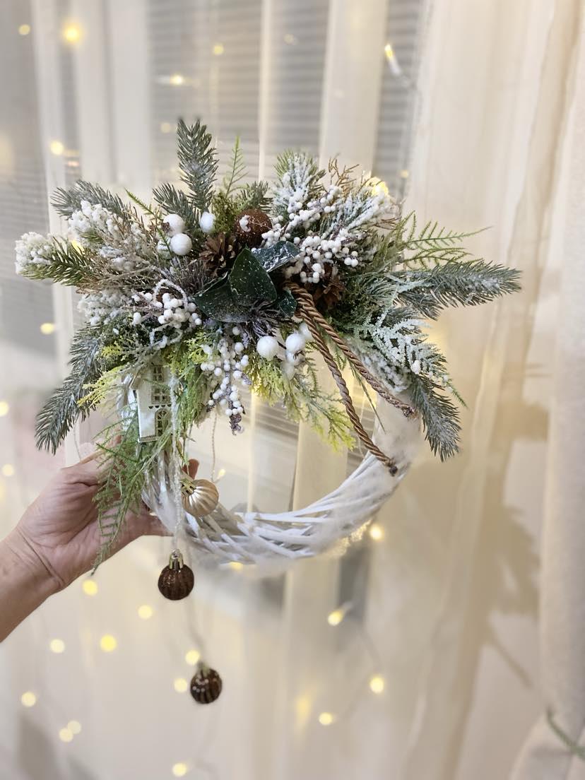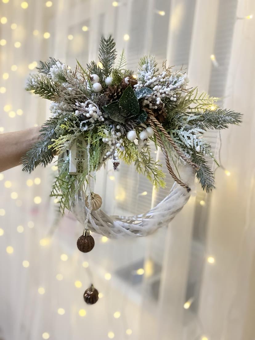 Delight your home with Christmas spirit with this beautiful Christmas wreath on a white rattan base. This wreath is not only suitable for hanging on the door, but also fits perfectly into your interior. The white rattan base is decorated with high quality faux chenille, white berries, pinecones and Christmas balls in brown, giving it an elegant and sophisticated look. Create a cozy Christmas atmosphere with this beautiful product that is sure to attract stars and add charm to your home.