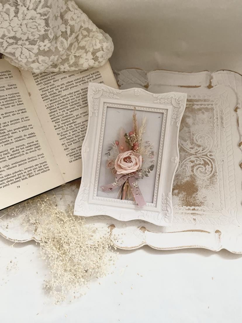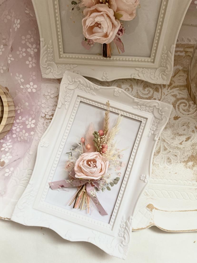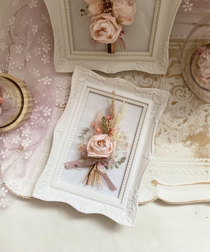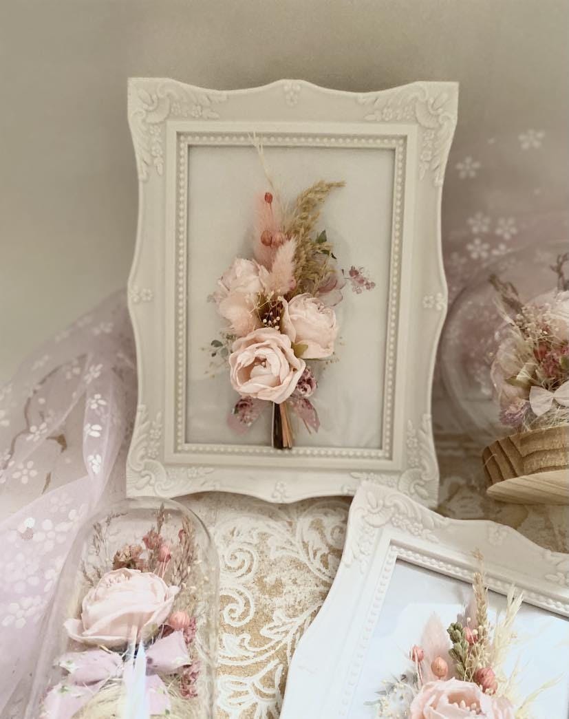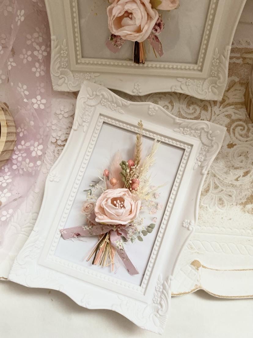 Preserved Floral Art Pink Rose Display Wedding Keepsake Frame Dried Flower Collection Romantic Wall Decor Cottage Style Design Natural Dried Wheat Accent Beautiful Bedroom Display Blush Pink Bloom Custom Size Frame