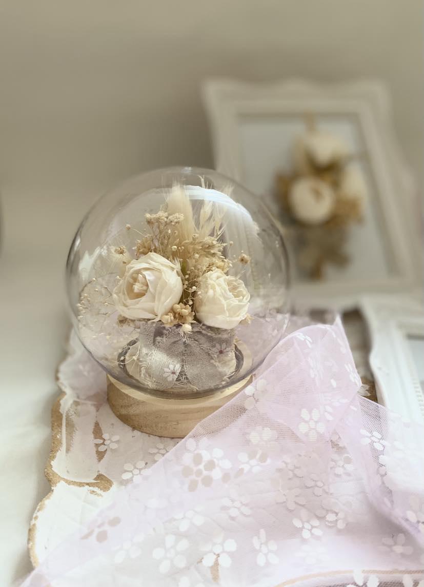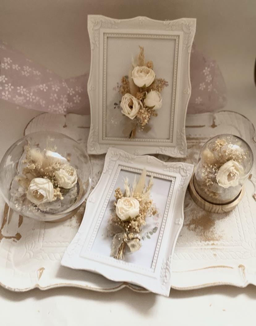 • Each piece includes preserved real flowers protected under glass