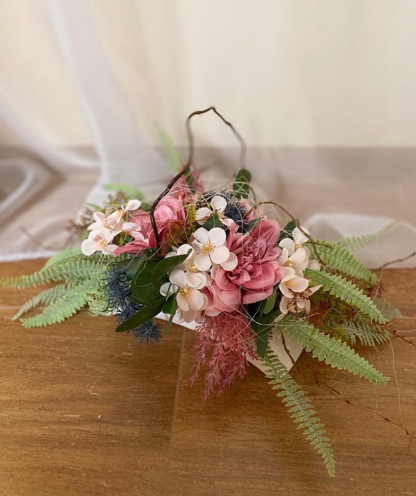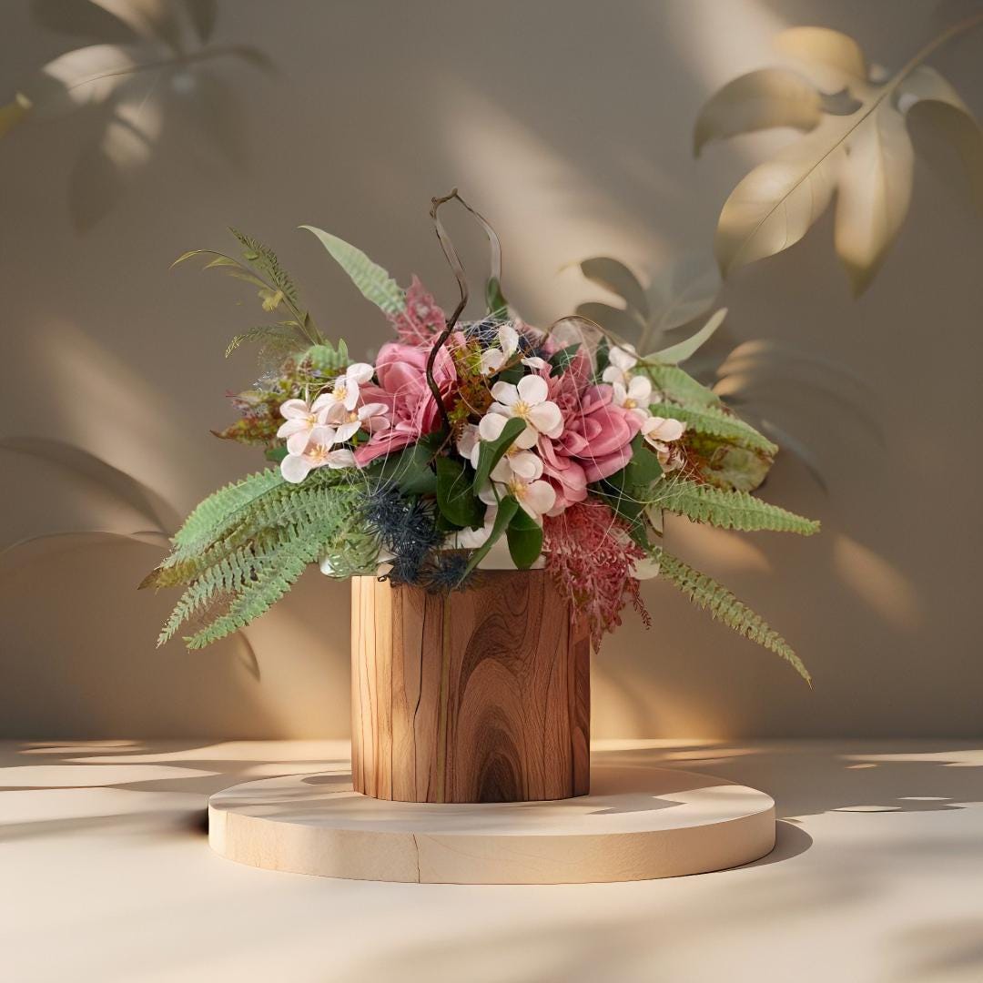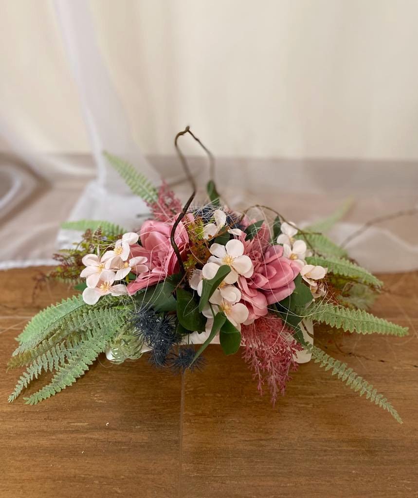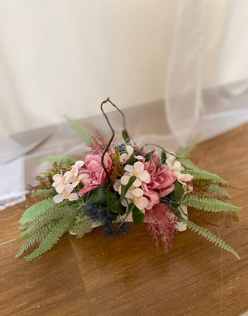 "Pink Memorial Decoration: Durable textile roses with matching flowers in a white container, perfect year-round for any setting. Custom colors available."
