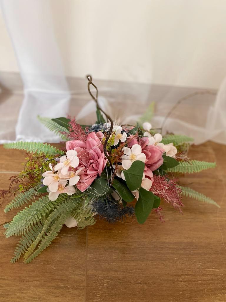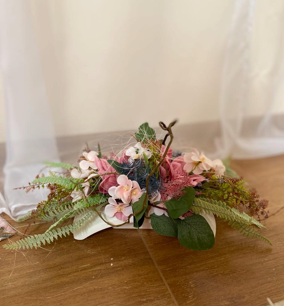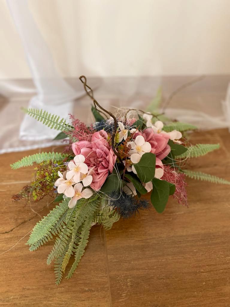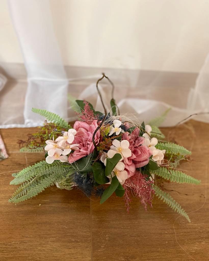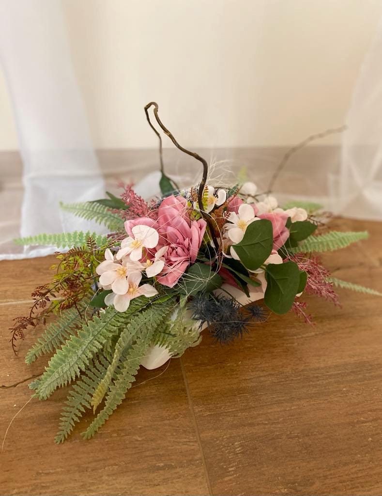"Pink Memorial Decoration: Durable textile roses with matching flowers in a white container, perfect year-round for any setting. Custom colors available."