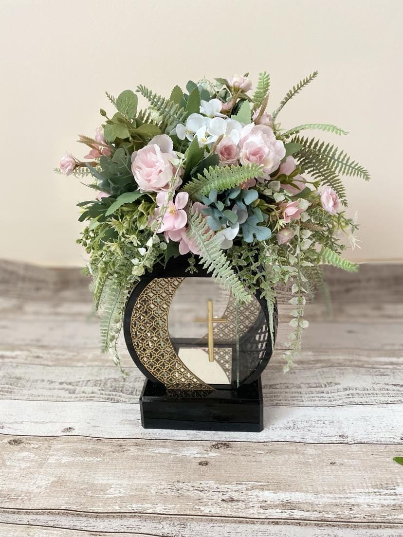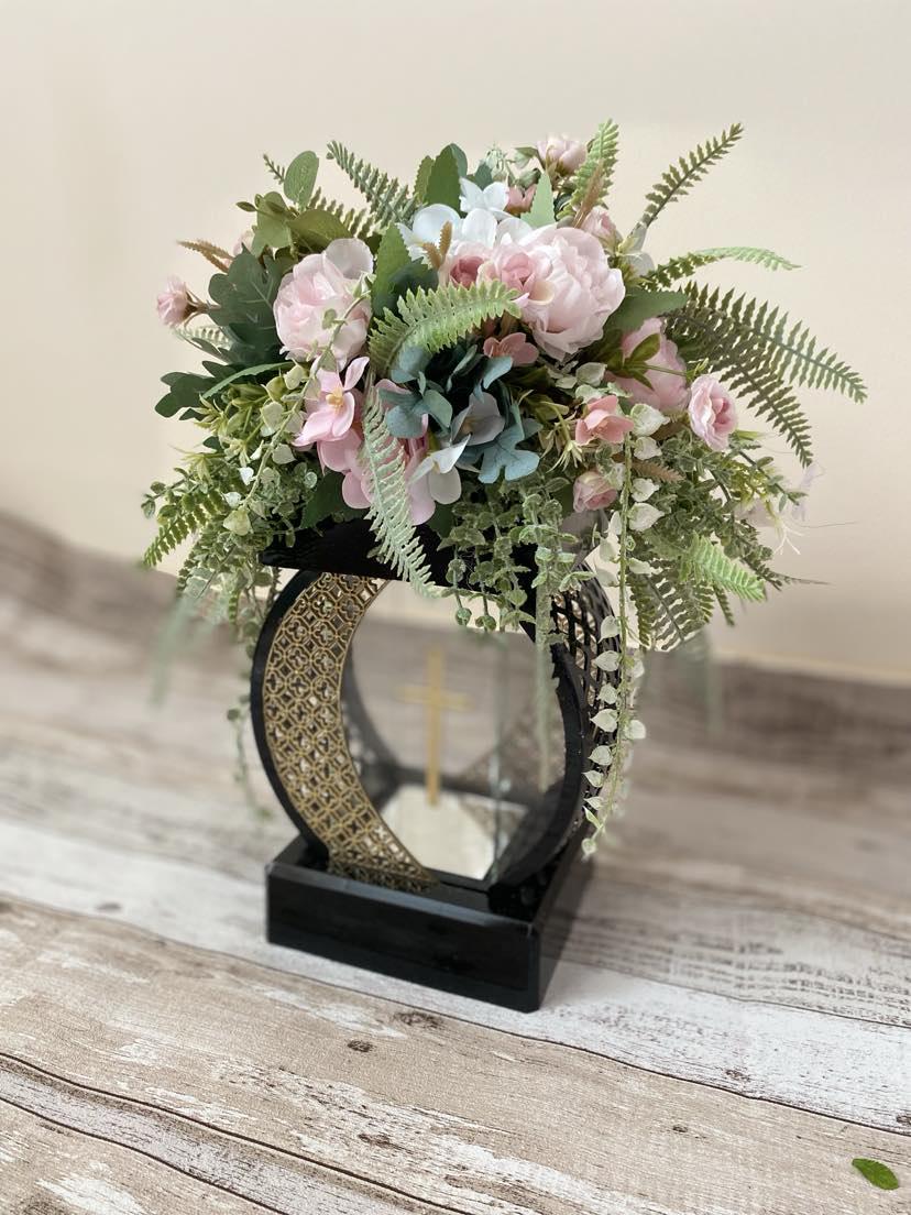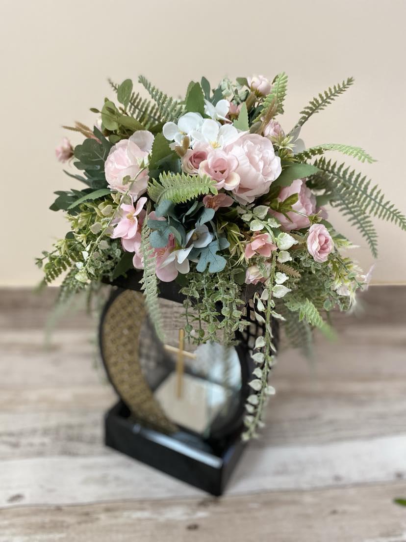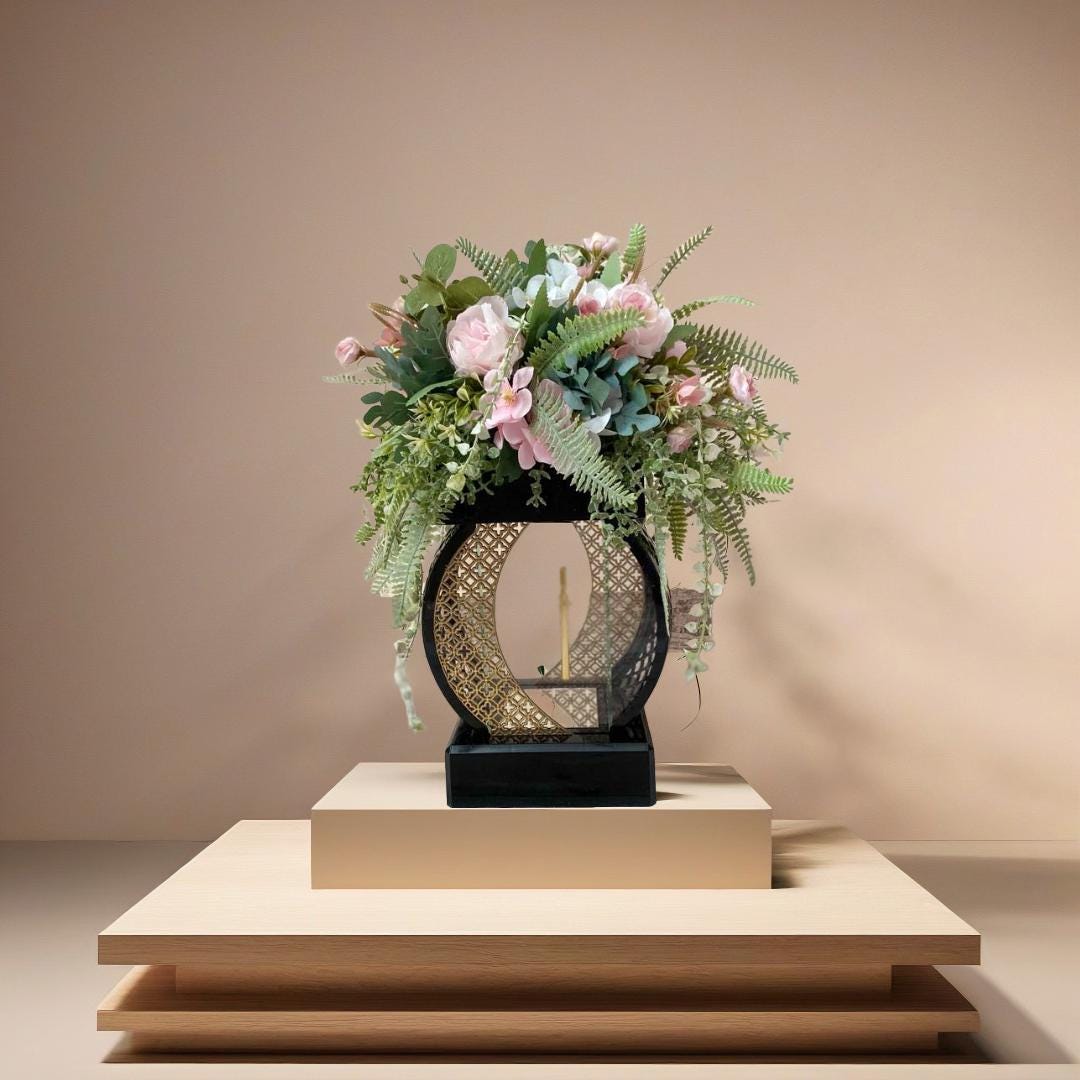The top part of the lantern can be easily opened, allowing you to place a candle or other meaningful tokens inside. It is adorned with high-quality textile flowers, meticulously arranged to add a touch of grace and serenity to the memorial site.