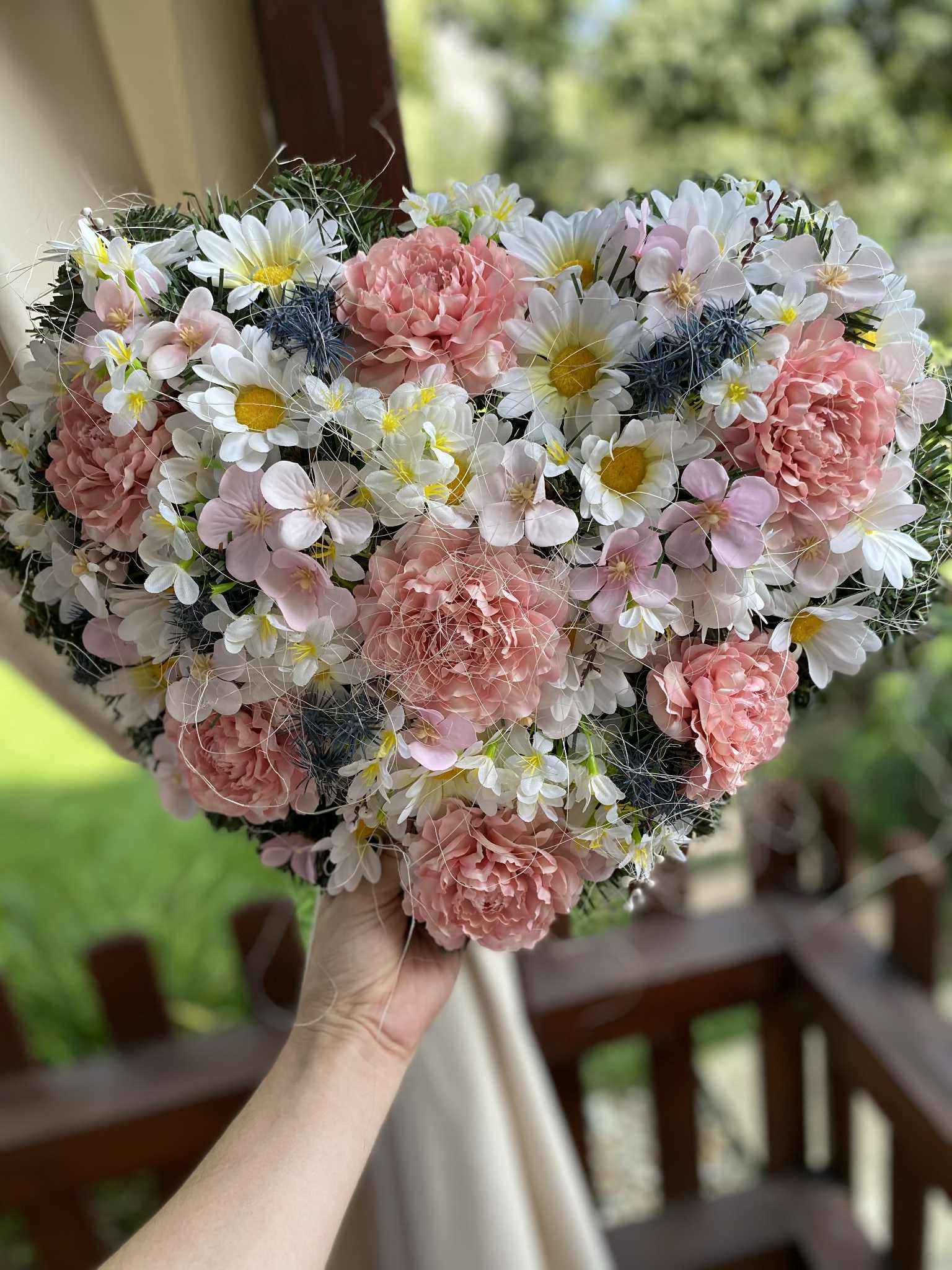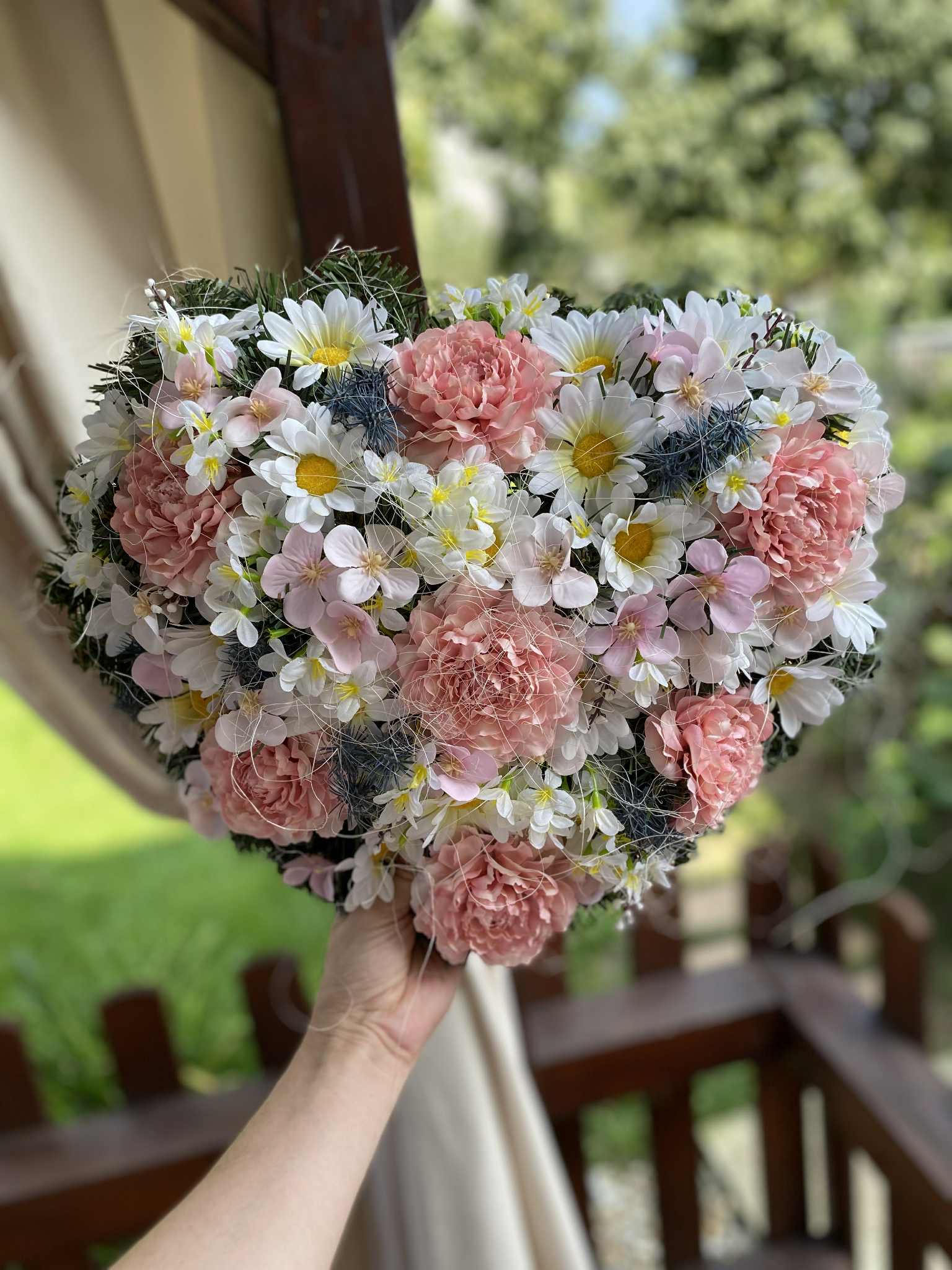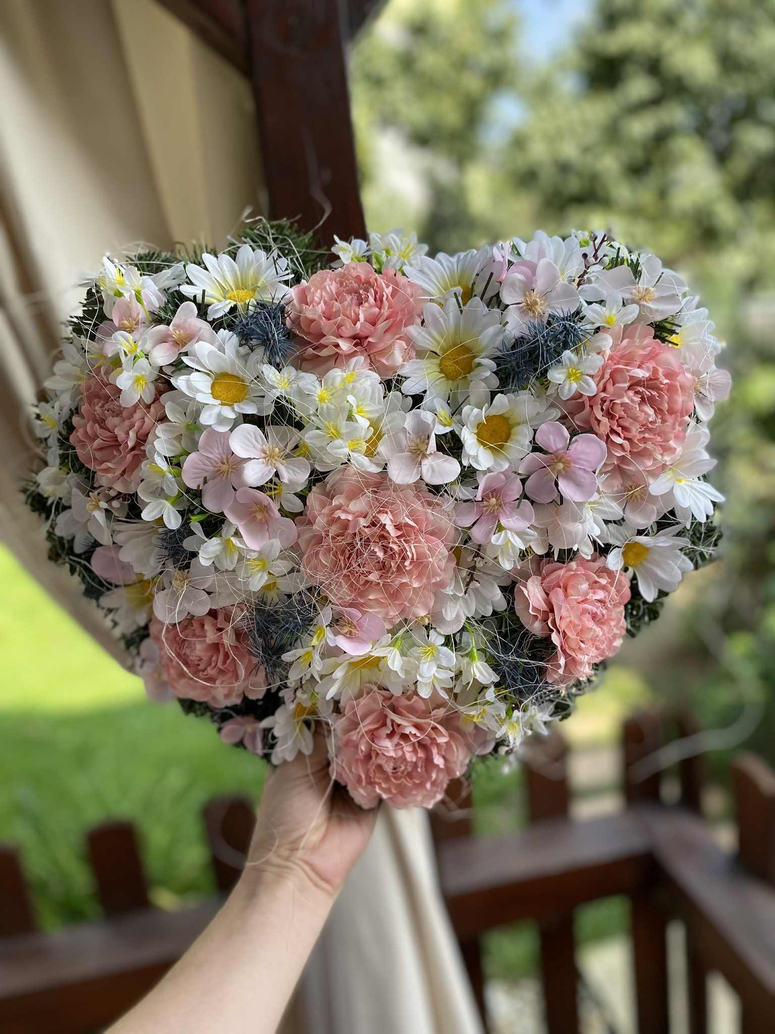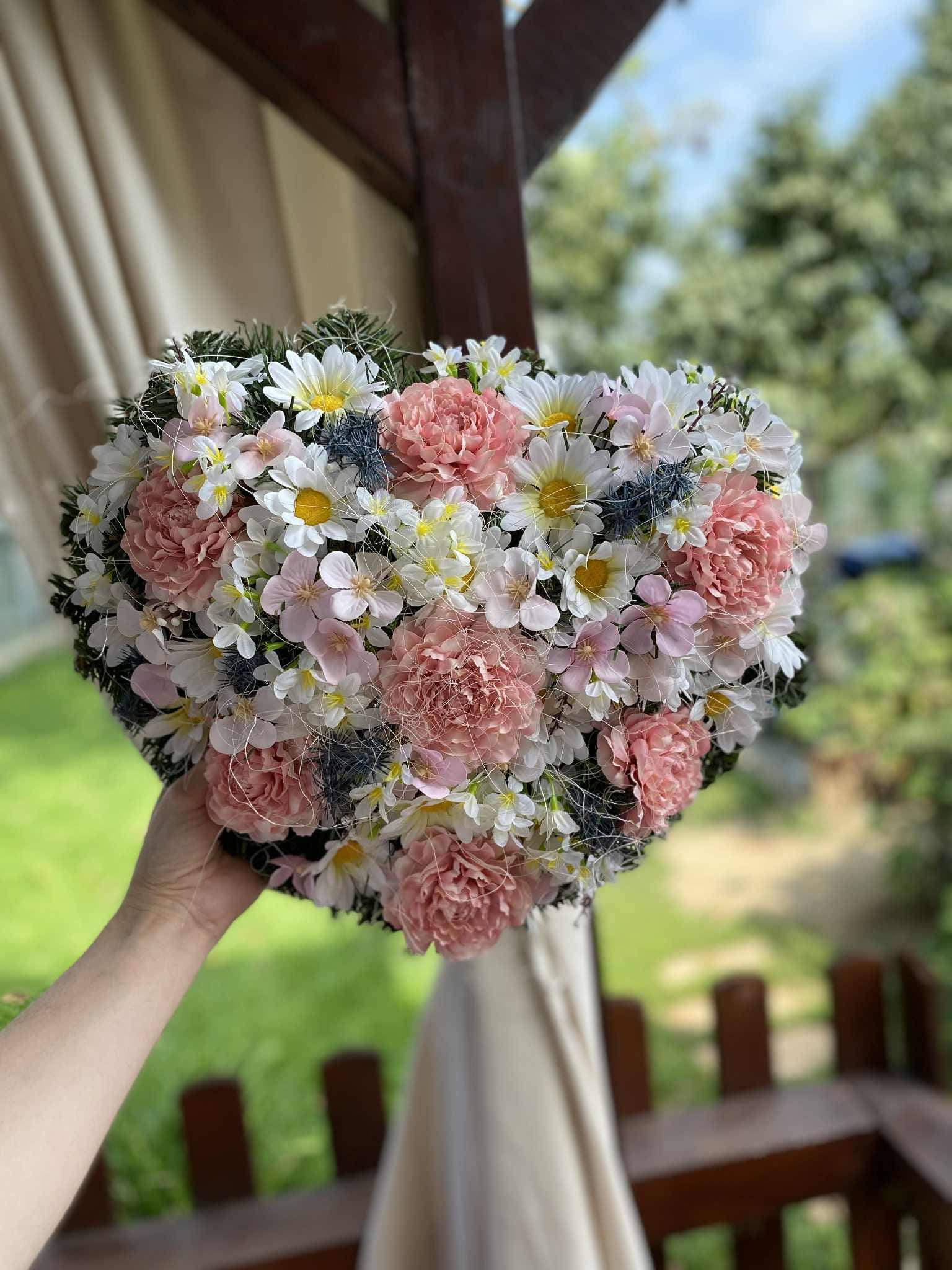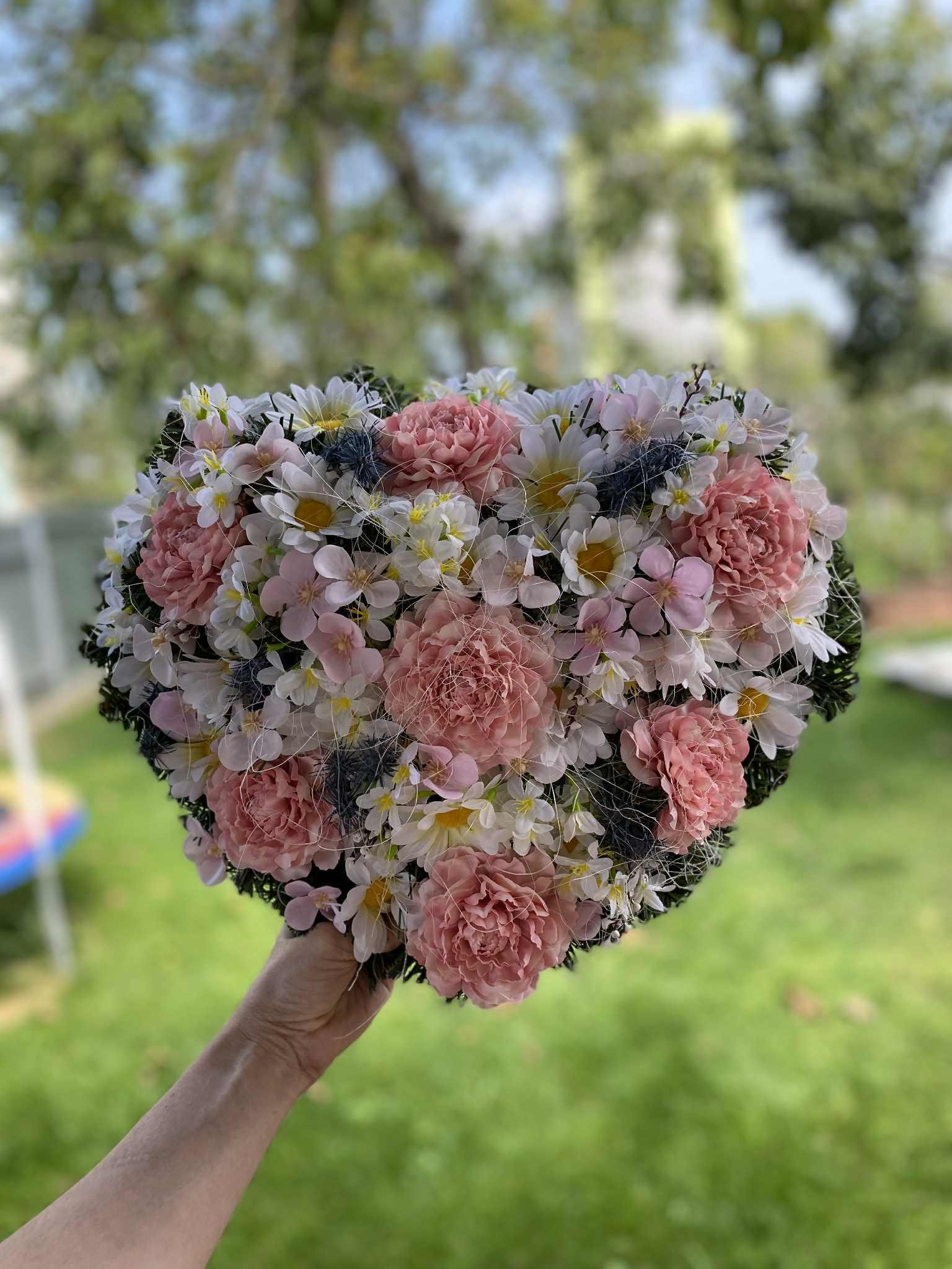 Pink Heart-Shaped Flower Wreath: An elegant outdoor memorial for All Saints' Day. Custom colors available for a lasting tribute