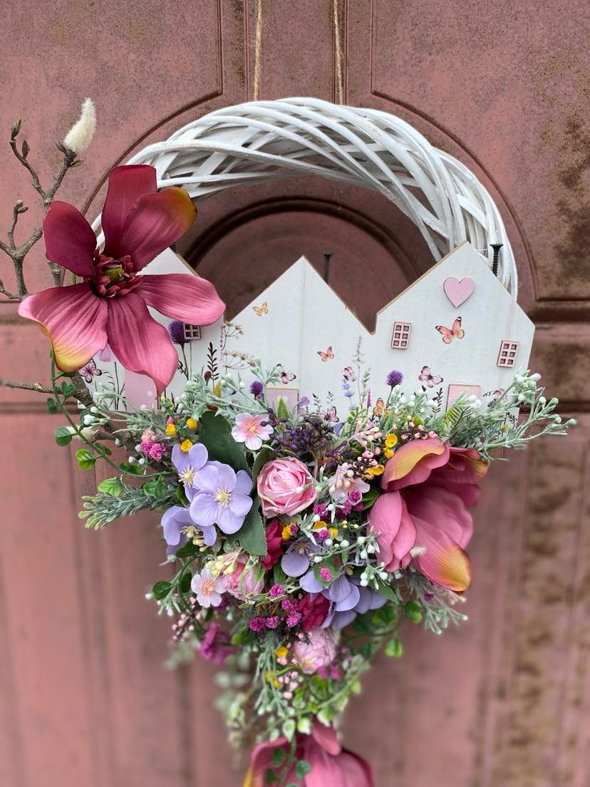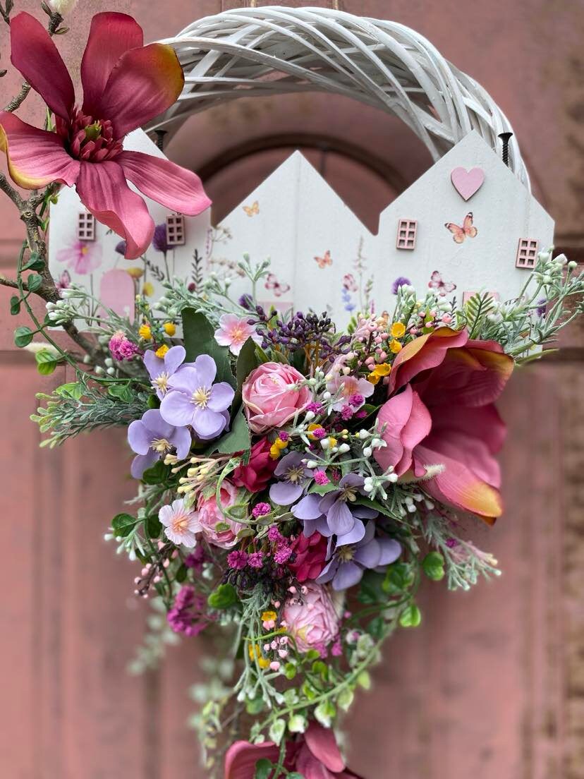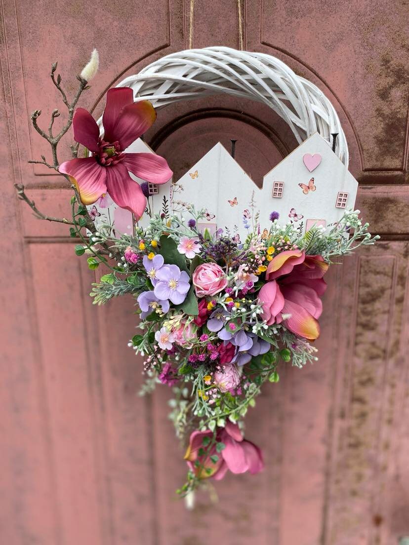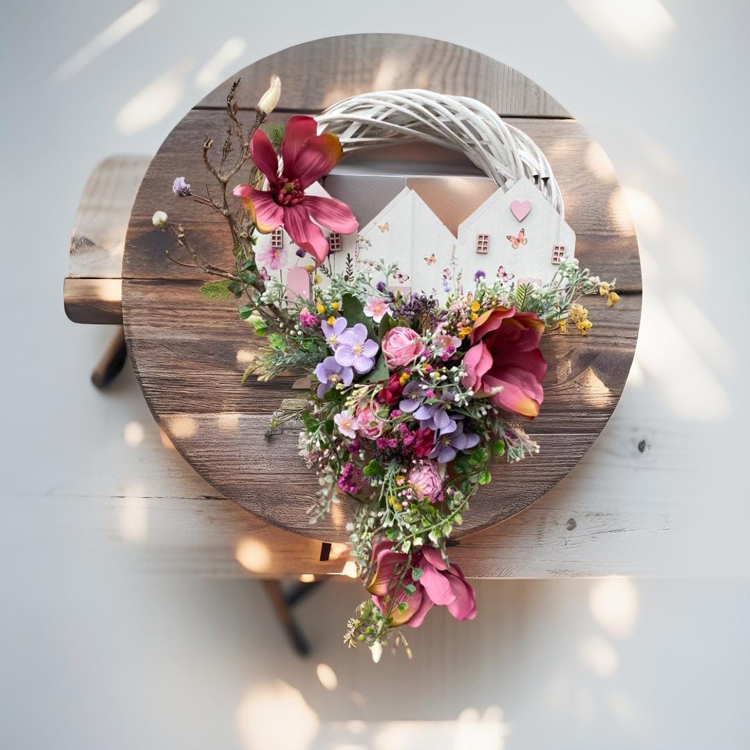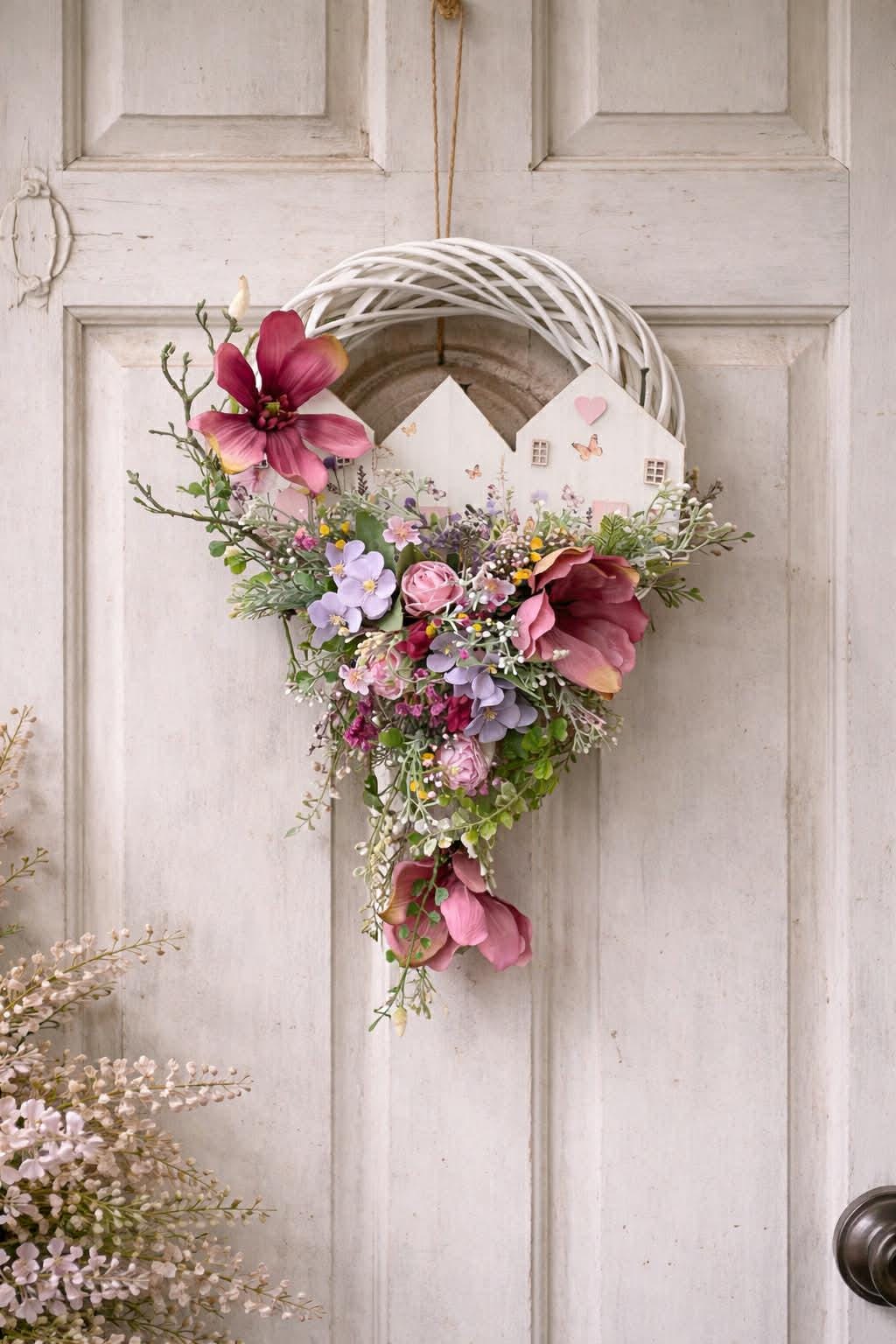 Decorate your home with our stunning Vintage Pastel Door Wreath. This elegant piece features delicate roses and magnolias in soft pink and purple tones, enhanced by charming wooden houses for a whimsical touch. Crafted on a rattan base, this wreath exudes vintage charm and invites warmth and beauty into any space. Perfect for adding a romantic flair to your decor.