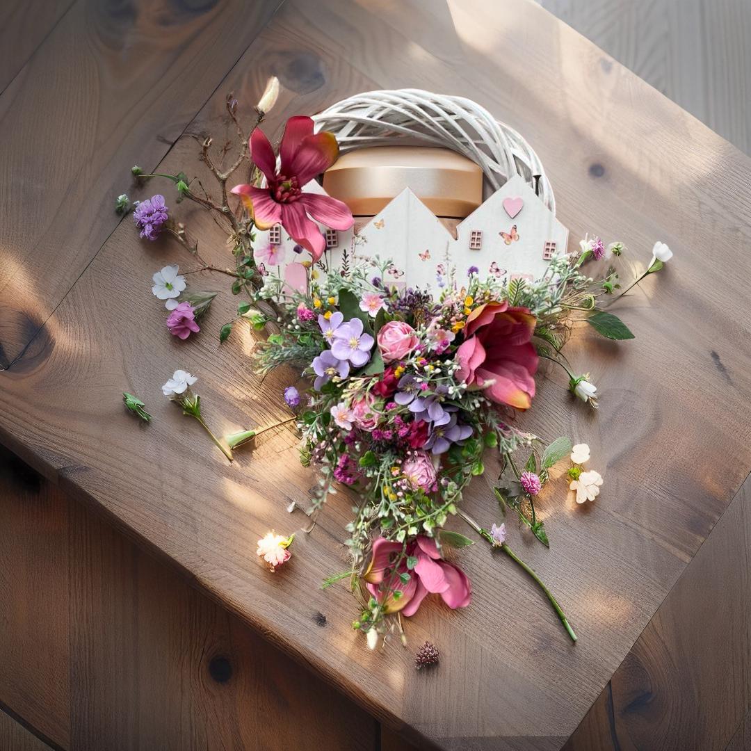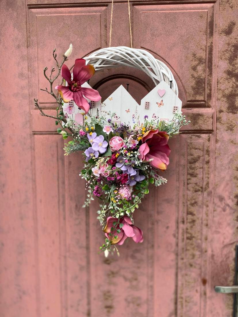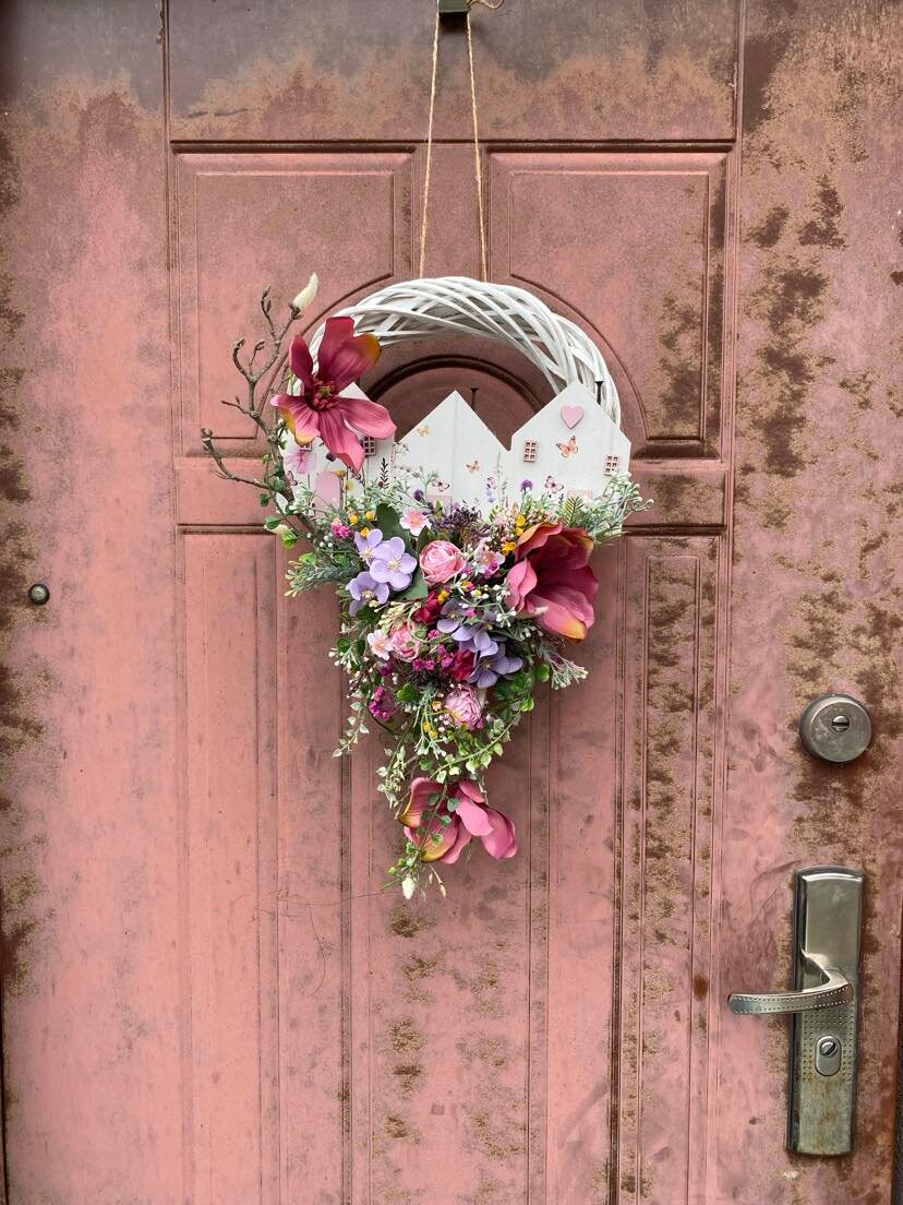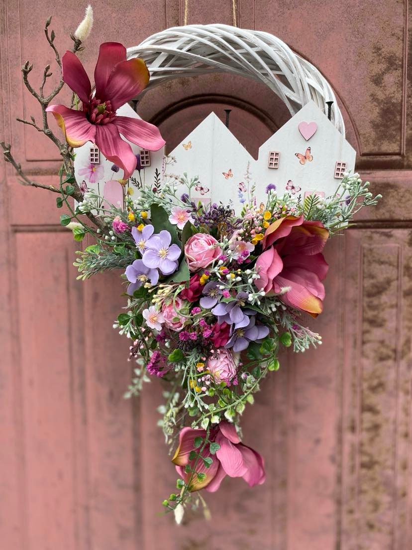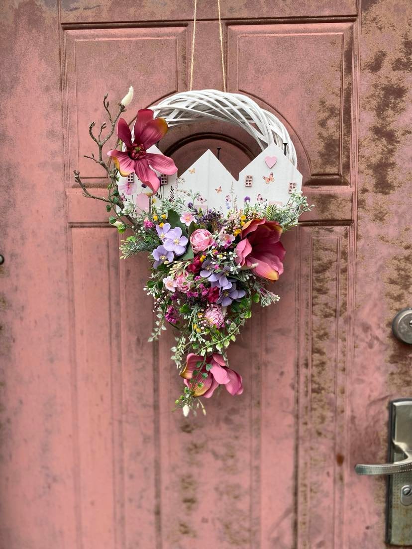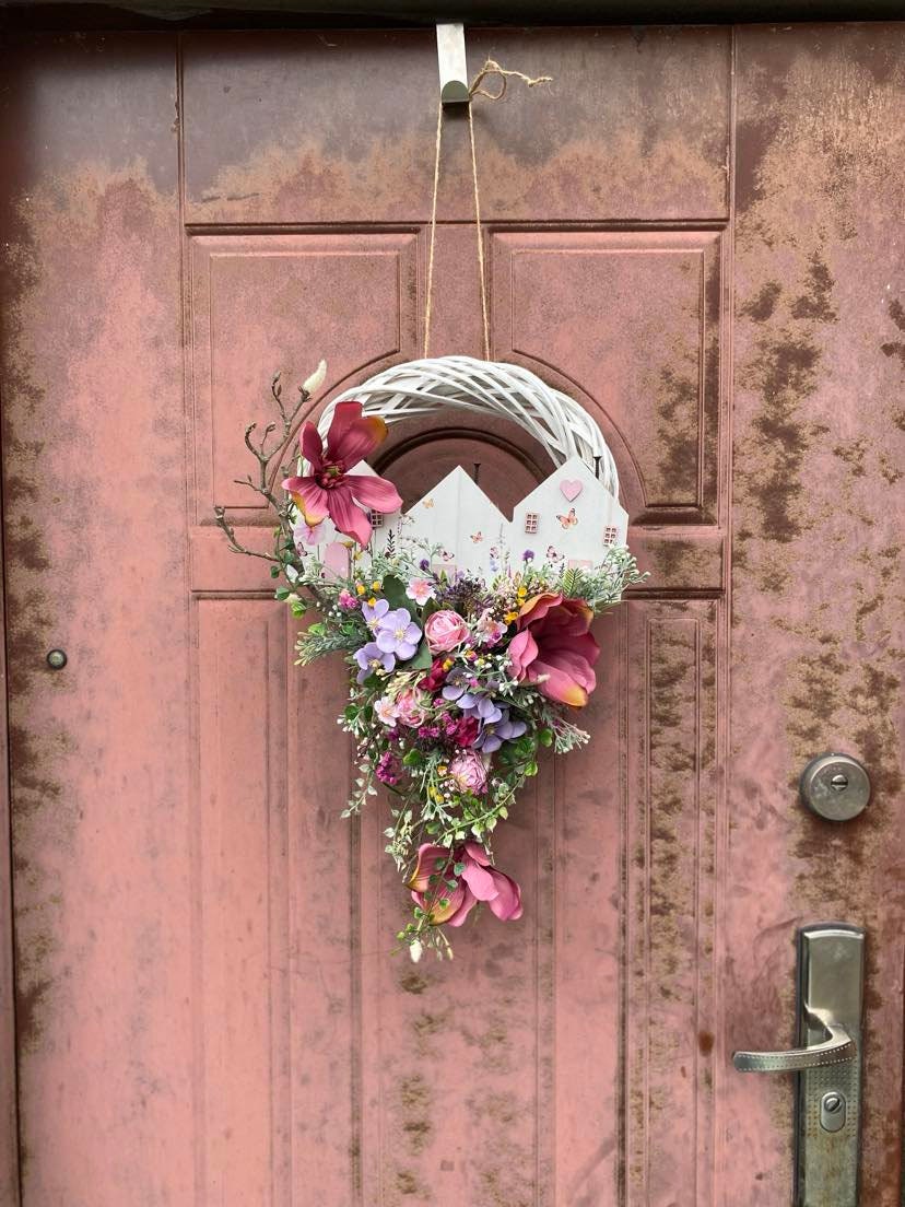 Decorate your home with our stunning Vintage Pastel Door Wreath. This elegant piece features delicate roses and magnolias in soft pink and purple tones, enhanced by charming wooden houses for a whimsical touch. Crafted on a rattan base, this wreath exudes vintage charm and invites warmth and beauty into any space. Perfect for adding a romantic flair to your decor.