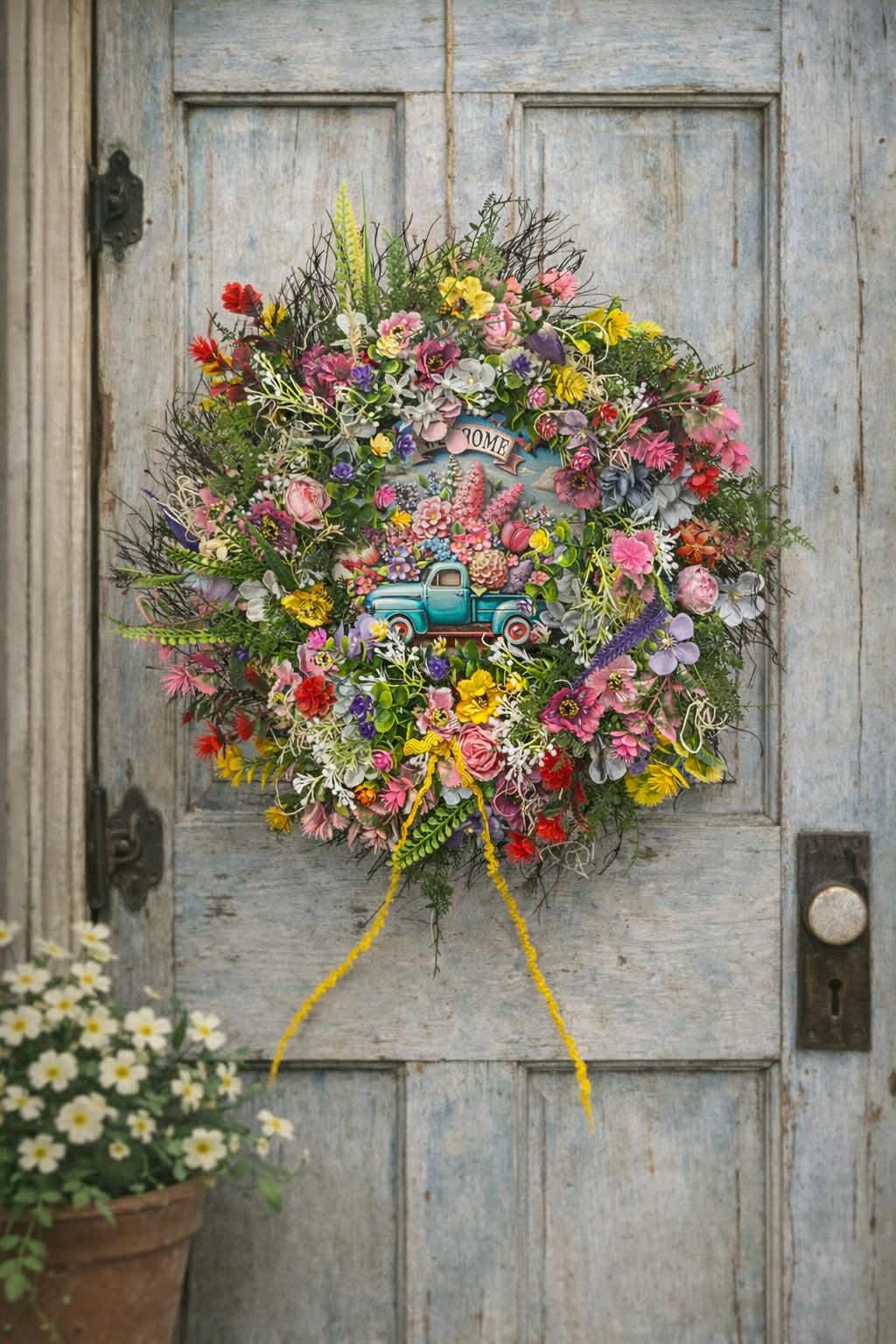 Delight your senses with a spring-themed wreath! This colorful wreath is like a little piece of spring right in your home. It consists mainly of fabric flowers in various colors, instantly bringing freshness and color harmony to your interior or exterior. Be innovative and let this spring wreath, with its cheerful and vibrant appearance, brighten up your space!